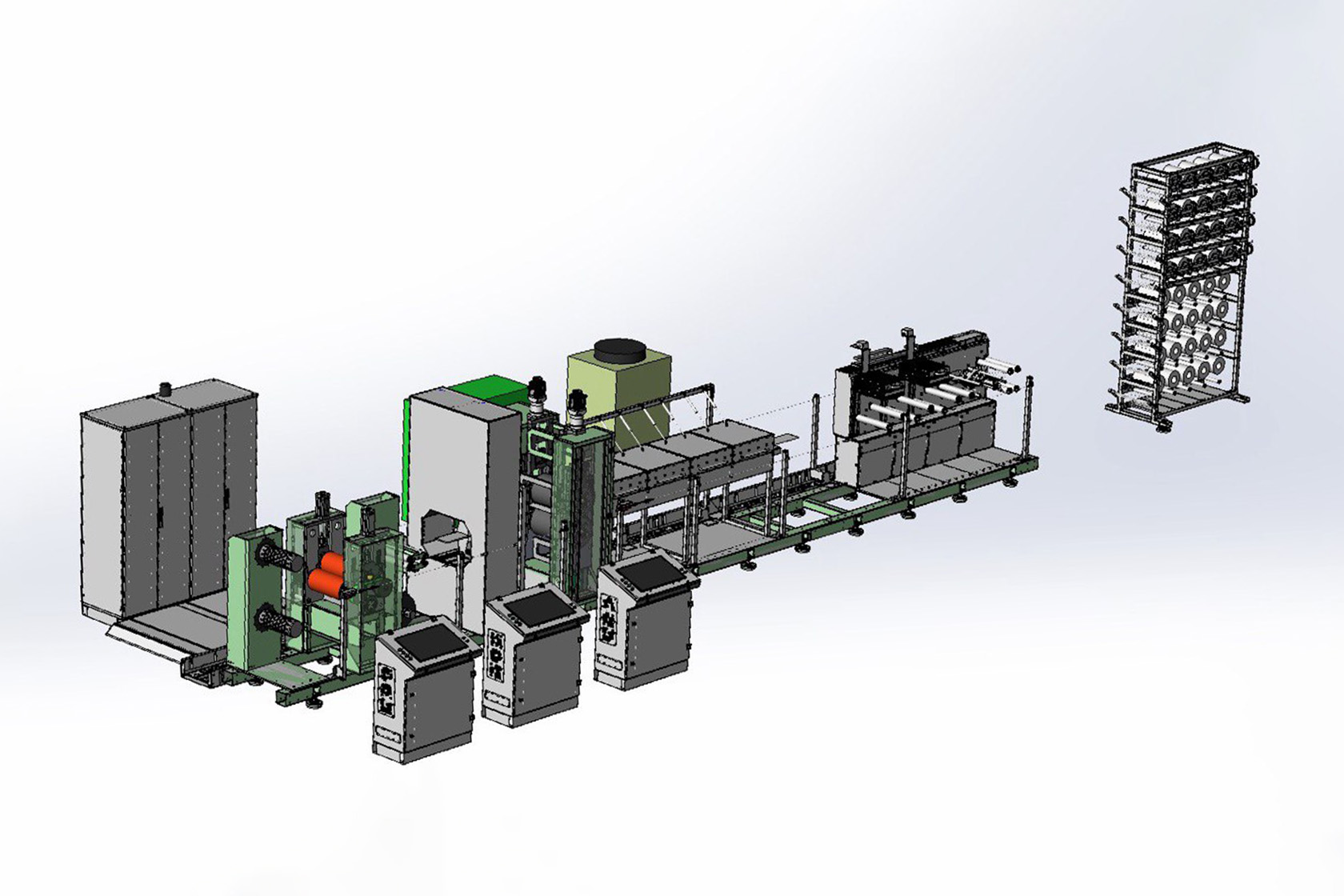 Единая линия, состоящая из 10 узлов, которые обеспечивают непрерывное производство однонаправленных безутковых термопластичных препрегов по суспензионной технологии.